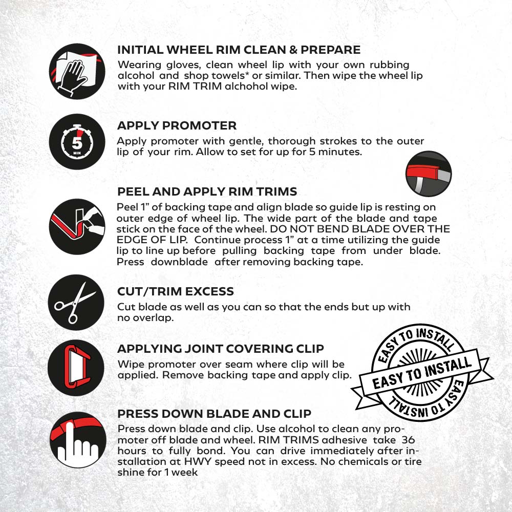 Each RT RimTrims kit includes 4 cut strips that fit up to a 24” wheel. Cleaning wipes and adhesive promoter wipes ensure a long lasting bond to the wheel surface. Joining clips are provided to cover the seam, leaving a professional finish.